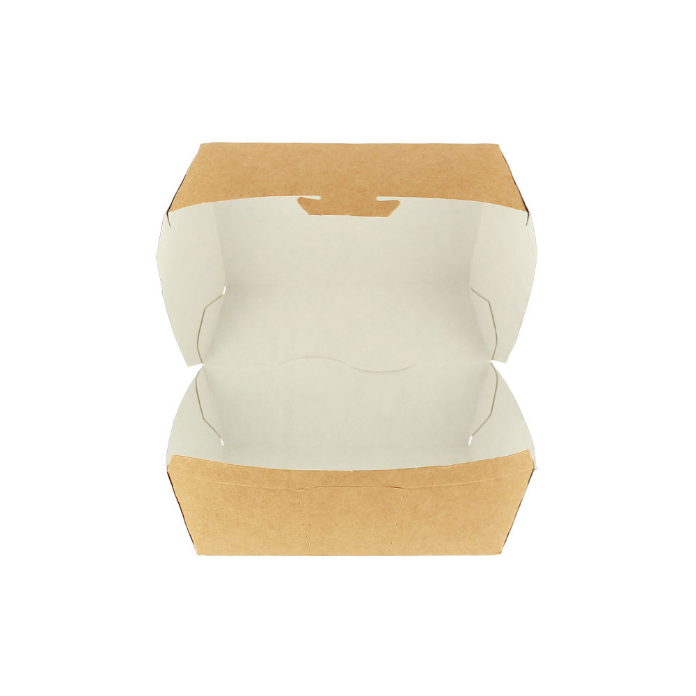 Caixas kraft para hambúrgueres, práticas e ecológicas. Mantêm o alimento quente e intacto, perfeitas para restaurantes e entregas.